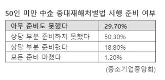 중소기업중앙회가 50인 미만 중소기업 892개사를 대상으로 실시한 설문조사에서도 중소기업의 80.0%는 '중대재해처벌법 시행에 준비하지 못했다'고 답했다. 준비하지 못한 이유에 대해서는 △전문인력 부족(35.4%) △예산 부족(27.4%) △의무 이해 어려움(22.8%) 등의 순으로 나타났다.