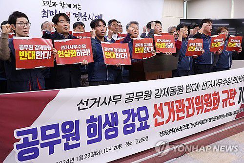 (창원=연합뉴스) 이정훈 기자 = 전국 공무원노동조합 경남지역본부와 경남 18개 시·군 공무원 노동조합이 23일 경남도청 프레스센터에서 공무원 희생을 강요하는 22대 총선 투개표 등 선거사무를 개선하라고 촉구했다.