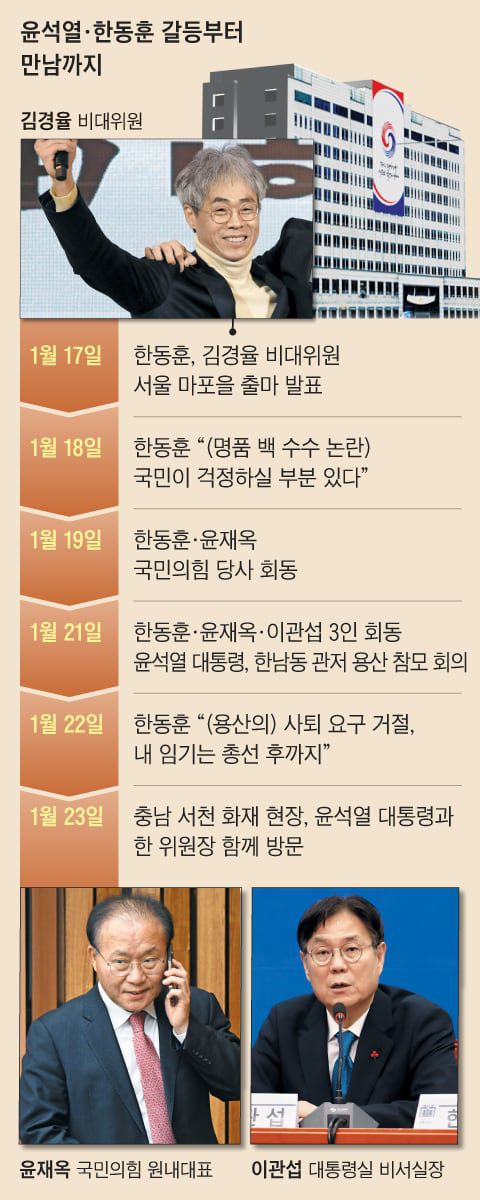 여권의 ‘투 톱’인 윤석열 대통령과 한동훈 국민의힘 비상대책위원장의 정면충돌이 일단 최악 상황은 피한 모양새다. 두 사람은 충남 서천시장 화재 현장에서 만나 서로 인사하며 어깨를 두드렸다. 짧게는 3일, 길게는 7일간 벌어진 이번 사태의 전후 사정은 이렇다.