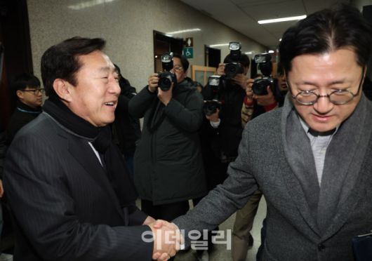 [이데일리 노진환 기자] 홍익표(오른쪽) 더불어민주당 원내대표가 24일 오전 50인 미만 중대재해처벌법 적용과 관련해 서울 여의도 국회를 방문한 김기문 중소기업중앙회장과 원내대표실로 들어가고 있다.