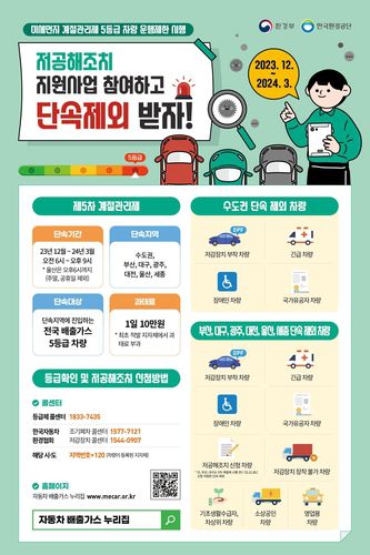 또한, 지난해 12월부터는 제5차 계절관리제 운행 제한도 시행하고 있다. 단속 제외 대상은 장애인, 경찰·소방·군용 특수공용 목적 등의 자동차와 저감장치를 부착한 자동차로, 어려운 경제 상황과 소비자 물가 상승 등을 고려해 저감장치 부착 불가 차량 중에서 기초생활수급자, 차상위 계층 및 소상공인은 예외적으로 운행할 수 있다.