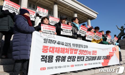 (서울=뉴스1) 김진환 기자 = 민주노총, 생명안전행동, 정의당이 24일 오전 서울 영등포구 여의도 국회 본청 앞에서 중대재해처벌법 50인 미만 적용 유예 연장 반대 긴급행동 돌입 기자회견을 하고 있다. 2024.1.24/뉴스1kwangshinQQ@news1.krCopyright ⓒ 뉴스1. All rights reserved. 무단 전재 및 재배포, AI학습 이용 금지.
