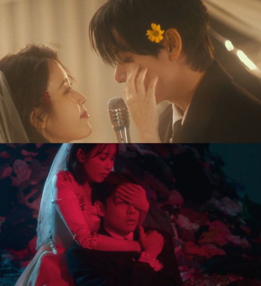 아이유와 뷔의 웨딩드레스와 턱시도 의상은 사랑의 결실을 상징한다. /유튜브 캡처 |