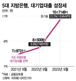 24일 금융권에 따르면 지난해 3분기말 5대 지방은행(BNK부산·BNK경남·DGB대구·광주·전북)의 대기업 대출 잔액은 10조7149억원으로 2022년 동기(8조750억원) 대비 22.5% 늘어났다. 같은 기간 중소기업 대출은 4.2% 증가에 그쳤다.