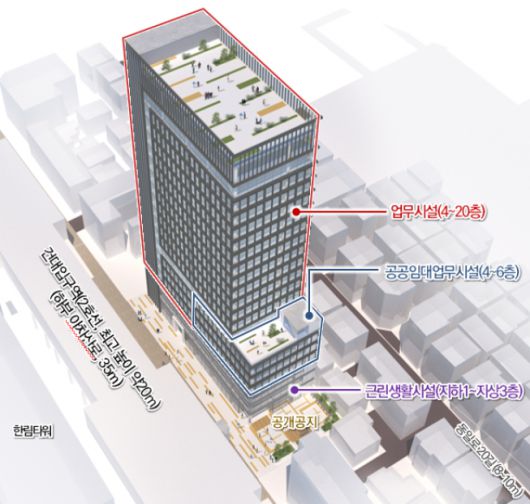 교통환경 개선과 공공의 필요시설에 대한 수요조사 결과를 반영해 대지와 접한 부분에 한해 이면도로를 2m 확폭 조성하고 건축물 일부에 공공임대업무시설을 설치할 계획이다.