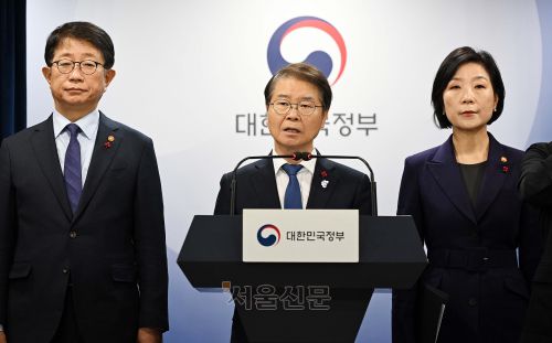 이정식 고용노동부 장관이 지난 24일 서울 종로구 정부서울청사에서 중대재해처벌법 추가 적용유예 개정안 입법 촉구 합동 브리핑을 하고 있다. 왼쪽부터 박상우 국토교통부 장관, 이정식 고용노동부 장관, 오영주 중소벤처기업부 장관. 오장환 기자 |