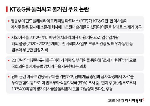 9년 만에 새로운 대표 선출을 앞둔 KT&G가 안팎으로 논란에 휩싸였다. 과거 업무상 목적으로 회사의 지원을 받아 출장을 간 일부 사외이사의 외유성 일정에 대한 문제 제기에 이어 담배 관련 규제를 무마하기 위해 국회의원들을 대상으로 이른바 '쪼개기 후원'을 했다는 의혹이 내부 폭로로 불거진 것이다. 전·현직 사외이사들이 자사주 감시에 소홀해 회사에 손해를 끼쳤다며 행동주의펀드가 이들을 상대로 소 제기를 청구하기도 했다. 앞서 포스코와 KT 등 소유 구조가 여러 주주로 분산된 소유분산기업에서도 대표 선출을 앞두고 비슷한 잡음이 발생한 탓에 KT&G도 신임 사장 후보군을 추리는 과정에서 주도권을 쥐기 위한 '판세 흔들기'가 벌어지고 있다는 관측이 힘을 얻고 있다.