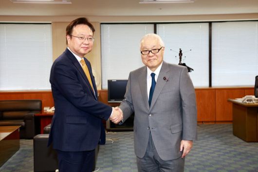 조규홍 보건복지부 장관(왼쪽)이 지난 25일 일본 후생노동성에서 다케미 게이조 후생노동성 장관과 만나 기념사진 촬영을 하고 있다. 보건복지부 제공 |