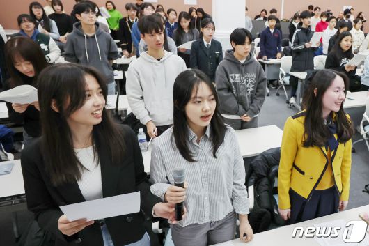 (서울=뉴스1) 민경석 기자 = 서울시교육청 학생참여위원회 소속 학생들이 26일 오전 서울 중구 서울시청 시민청에서 열린 '제9회 서울시 학생인권의 날 기념식'에 참석해 학생인권조례를 낭독하고 있다. 2024.1.26/뉴스1newsmaker82@news1.krCopyright ⓒ 뉴스1. All rights reserved. 무단 전재 및 재배포, AI학습 이용 금지.