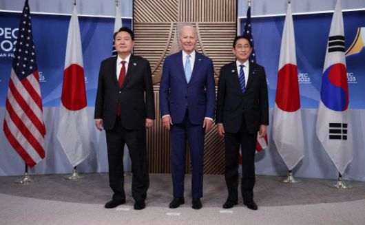 지난해 미국 샌프란시스코 아시아태평양경제협력체(APEC) 정상회의에서 만난 윤석열(왼쪽부터) 대통령, 바이든 미국 대통령, 기시다 후미오 일본 총리.(사진=연합뉴스) |