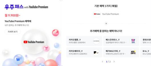 SK텔레콤은 구독서비스 ‘T우주패스’에서 유튜브 프리미엄에 가입하면 월 9900원에 이용할 수 있도록 했다. 유튜브 내 가입은 월 1만4900원인데 5000원 더 싸다. 여기에 카카오웹툰, 배스킨라빈스, 롯데시네마 등 추가 할인혜택 중 원하는 것을 하나 골라 이용할 수 있는 기획전도 진행하고 있다.