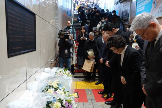 고 이수현씨의 23주기를 맞아 26일 사고 현장인 도쿄 JR 신오쿠보역에서 이씨의 모친 신윤찬(오른쪽에서 두 번째)씨와 윤덕민(가장 오른쪽) 주일 한국대사 등이 헌화한 뒤 묵념하고 있다. 2024.1.26 도쿄 연합뉴스 |