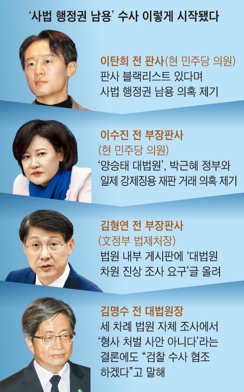 서울중앙지검이 법원행정처를 10시간 압수 수색했고 100명이 넘는 판사들을 소환 조사했다. 윤석열 대통령이 당시 중앙지검장이었고 한동훈 국민의힘 비대위원장은 중앙지검3차장이었다. 당시 수사로 양승태 전 대법원장이 2019년 1월 대법원장 출신으로는 헌정 사상 처음으로 구속됐고, 같은 해 2월 박병대·고영한 전 대법관과 함께 ‘재판 개입’ 등 혐의로 기소됐다. 이 사건으로 양 전 대법원장을 포함한 고위 법관 14명이 재판을 받게 됐다.