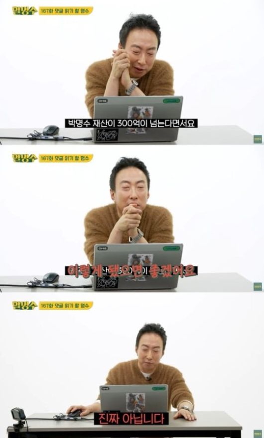 한편, 박명수는 '박명수 재산이 300억이 넘는다'는 댓글에 대해 "이렇게 됐으면 좋겠다. 이거 아니다. 한경호 전무도 안다. 이번에 보너스도 못 줬다"며 "진짜 아니다. 절대 아니다"라며 거듭 강조했다.