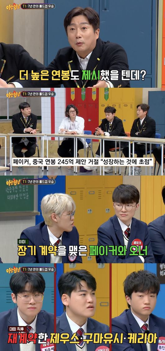 반대로 제우스, 구마유시, 케이라는 다른 팀과 계약할 기회가 있었음에도 의리를 지켰다고. 제우스는 “사실 이번에 MVP도 타서 분위기가 좋았다. 한 번 돌아볼까 하고 돌아봤는데 그래도 남고 싶더라. 남으니까 ‘아는 형님’도 나오고 좋다”라고 웃었다. 이어 구마유시는 “나는 원래 T1에 충성도가 높아서 (이적) 생각 안 했다”라고 했고, 케리아는 “나 같은 경우 다른 팀에서 돈을 더 준다고 해도, 조건이 좋아도 T1에 남는 게 메리트가 있다고 생각했다”라고 밝혔다. 이때 이진호는 “제의 안 왔지?”라고 물었고, 케리아는 노코멘트 하겠다고 답해 웃음을 안겼다.