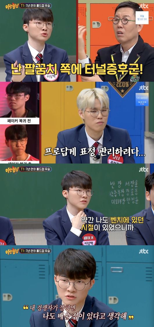 페이커는 “나도 벤치에 있던 시절이 옛날에 있으니까 불안한 감정도 있었다. 그런데 그 사람이 잘하면 배울 점도 있다고 생각한다”라며 주전 경쟁이 오히려 동기부여가 된다고 밝혀 형님들을 감동케 했다. 그 말에 서장훈은 “동기부여가 되는데 너무 행복하고 그렇지 않다는 거다. 페이커가 아주 인성이 훌륭한 거다”라고 치켜세웠다.