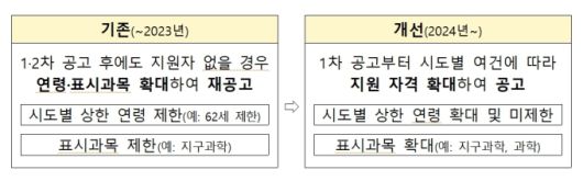 기존 채용은 1·2차 공고 후에도 지원자가 없으면 연령과 표시과목을 확대해 재공고하는 형식이었다. 하지만 앞으로는 1차 공고부터 시도별 여건에 따라 지원 자격을 확대해 공고한다.