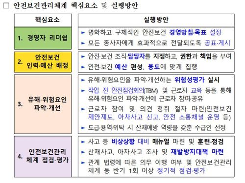 ▲ 우선 명확하고 구체적인 안전보건 경영방침 및 목표를 수립해 회사 내의 모든 종사자가 알 수 있도록 공표·게시해야 한다. 법에 따라 필요한 안전보건 전문인력의 수를 확인해서 안전보건관리담당자, 관리감독자 등을 지정하고, 재해 예방에 필요한 적정 예산을 편성해야 한다. 유해·위험요인을 확인·개선하는 절차를 마련하고, 이에 따라 확인·개선이 이루어졌는지 정기적으로 점검·조치하는 체계도 갖춰야 한다. 중대재해처벌법 바로알기(www.koshasafety.co.kr) 내 '중대재해처벌법 자료'에서 매뉴얼과 업종별 가이드 등을 활용할 수 있다.