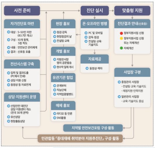 또, 전국 30개 권역에 ‘산업안전 대진단 상담·지원센터’를 구성·운영해 안전보건관리체계·컨설팅·교육·기술지도와 시설개선 재정지원 등을 맞춤형으로 지원한다.