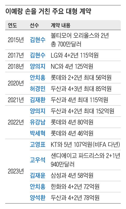 국내 선수들이 꿈의 무대 메이저리그에 도전할 때나 그 동안 땀 흘린 선수들이 그 대가로 대박 계약을 터뜨릴 때마다 어김 없이 등장하는 사람이 있다. 리코에이전시의 이예랑(44) 대표다. 그는 2023시즌 후 김재윤(34·삼성) 안치홍(34·한화) 양석환(33·두산) 임찬규(32·LG) 고우석(26·샌디에이고 파드리스) 고영표(33·KT)의 대형계약을 잇달아 성사시키며 올 스토브리그를 뜨겁게 달궜다. 그가 올 겨울 성사시킨 계약 총액 규모만 해도 약 500억원에 이른다. 서울 강남구 사무실에서 만났던 지난 23일, 마침 고영표의 비(非) 다년 100억원대 계약 소식이 들려왔다.
