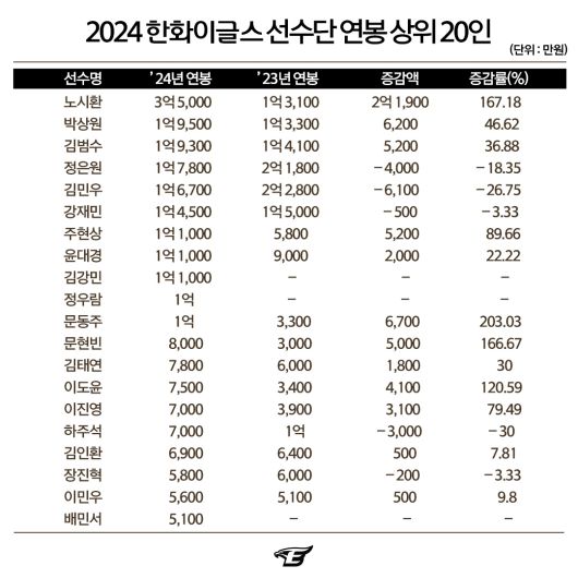 100경기 이상 출장하며 주전급으로 성장한 문현빈(3000만원→8000만원), 이진영(3900만원→7000만원), 이도윤(3400만원→7500만원)도 연봉이 크게 올랐다.