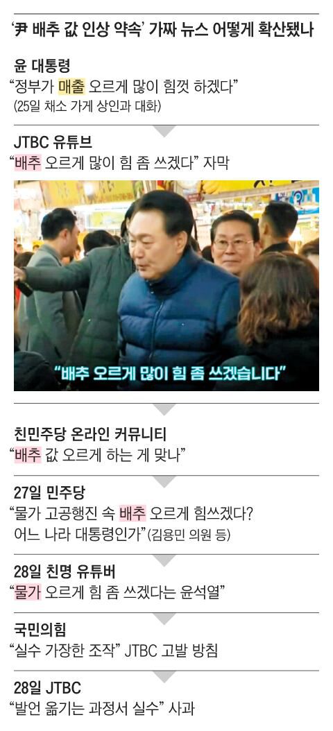 윤 대통령의 ‘배추 가격 인상’ 발언 논란은 JTBC의 자막 실수에서 비롯됐다. 윤 대통령은 지난 25일 경기 의정부 제일시장을 방문해 채소 가게 상인과 대화하면서 “정부가 매출 오르게 많이 힘껏 하겠습니다”라고 했다. JTBC는 유튜브에서 이 장면을 보여주면서 ‘배추 오르게 많이 힘 좀 쓰겠습니다’라고 자막을 달았다.