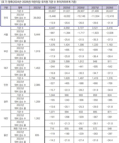 연구진은 통계청의 장래인구 추계(저위 추계)를 활용해 취원율과 정원 충족률이 동일하게 유지된다고 가정해 향후 어린이집과 유치원 수를 예측했는데, 2022년 3만9천53곳이던 어린이집과 유치원의 수가 2028년 2만6천637곳으로 줄어들 것으로 내다봤다.