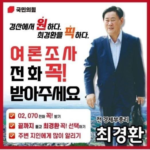30일 아시아경제의 취재를 종합하면 페이스북에는 지난 22일 오후 3시께 국민의힘 정당 로고가 왼쪽에 찍힌 총선 선거 홍보물이 “경산에서 원하다. 최경환을 픽하다. 여론조사 전화 꼭 받아주세요”라는 문구와 함께 올라왔다. 온라인에 게재된 홍보물은 최 전 부총리 측의 지지자들과 유권자들에 의해 복사하기, 캡처하기 등으로 페이스북이나 밴드를 통해 빠르게 퍼져나갔고, 이후에도 2~3일간 사회관계망서비스(SNS) 상에 지속해서 노출됐다.