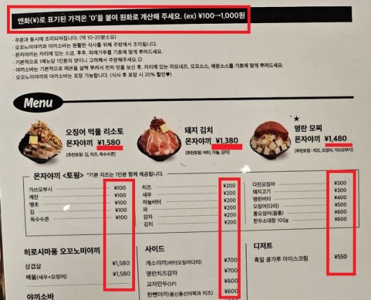 메뉴판 상단에는 ‘엔화(¥)로 표기된 가격은 0을 붙여 원화로 계산해달라’라며 예시로 ‘100엔(¥)은 1000원’이라고 친절하게 써 붙였다.