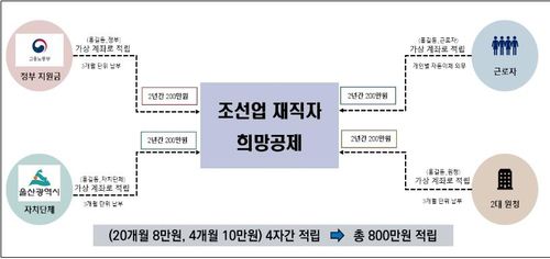 사업 내용은 정부·울산시·원청·근로자 4자가 각각 2년간 200만 원씩 납입하고, 만기 시 근로자에게 800만 원을 지급하는 것이다. 근로자의 실질임금 인상을 통해 이직률을 감소시키고 기술 숙련도는 높인다는 취지다.