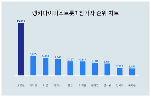 순위 키워드 트렌드지수 남성 여성 1 오유진 15,811 41% 59% 2 배아현 5,855 51% 49% 3 나영 5,358 49% 51% 4 빈예서 4,949 42% 58% 5 풍금 4,267 54% 46% 6 박지윤 4,247 36% 64% 7 천가연 3,801 64% 36% 8 양서윤 3,611 40% 60% 9 정서주 2,230 57% 43% 10 복지은 2,151 58% 42% [출처: 랭키파이 인물 미스트롯3 참가자 트렌드 테이블]