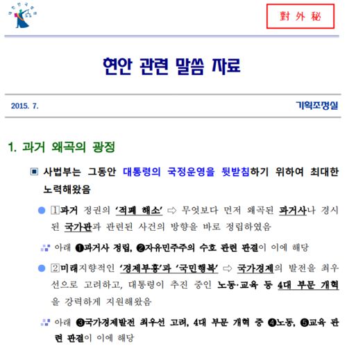 문제의 문건들은 2015년 7·8월 법원행정처 심의관들이 작성했다. 문건은 ‘과거 왜곡의 광정(잘못된 것을 바로잡아 고침)’, ‘정부 운영에 대한 사법부의 구체적 협력 사례’와 같은 제목 아래 전교조 법외노조 사건, 원세훈 전 국가정보원장의 대선개입 사건, KTX 승무원 사건, 쌍용차 정리해고 사건, 긴급조치 사건 등을 언급한다.