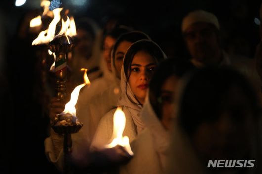 [테헤란=AP/뉴시스] 30일(현지시각) 이란 테헤란 외곽에서 고대 이란의 겨울 축제인 사다 축제가 열려 조로아스터교 청년 신도들이 대형 모닥불을 점화할 횃불을 옮기고 있다. 사다는 페르시아어로 '100'이라는 뜻으로 봄의 시작까지 100일 남았다는 뜻이다. 한겨울 축제인 사다는 불을 기리고 어둠, 서리, 추위를 물리친다는 의미를 담고 있다. 2024.01.31.