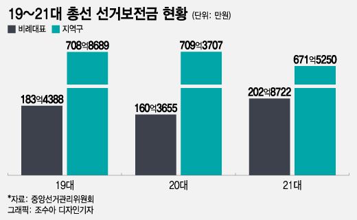 21대 총선 당시 선거보조금은 △더불어민주당 120억3814만원 △미래통합당 115억4932만원 △민생당 79억7965만원 △미래한국당