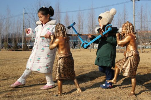30일 오후 대구 달서구 조암네거리 인근 길가에 나온 주민 김은혜 씨(37·여)는 최근 새롭게 놓인 원시인 조형물을 살펴보며 이렇게 말했다. 딸 이은정 양(6)은 조형물이 낯설어 엄마 품으로 몸을 숨기더니 이내 호기심이 발동한 듯 엄마의 바짓가랑이를 붙잡은 채 원시인 조형물을 이리저리 살펴보고 만져도 봤다. 이 양은 엄마에게 “원시인이 타임머신을 타고 미래로 왔다”고 외쳤다. 이 양의 천진난만한 동심에 엄마는 물론이고 주변에 있던 행인들까지 함박웃음을 지었다.