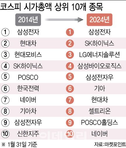 31일 마켓포인트에 따르면 10년 전(2014년)과 비교해 코스피 시가총액 상위 10위권에서 바뀐 종목은 3개에 불과했다. 지난 2000년 이후 부동의 시가총액 1위는 삼성전자(005930)가 지키고 있고 현대모비스(012330)(3→18위)와 한국전력(015760)(6→29위), 신한지주(055550)(10→16위)가 10위권 밖으로 밀려났다. 3개 종목을 대신해 10위권 내 진입한 기업은 신규 상장한 LG에너지솔루션(373220)과 삼성바이오로직스(207940), 그리고 코스닥에서 이전상장한 셀트리온(068270)뿐이다.