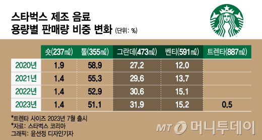 또 2020년부터 지난해까지 4년간 용량별 판매량 비중을 살펴보면 그란데는 4년 전인 2020년보다 4.7% 늘어난 31.9%를 기록했다. 같은 기간 벤티의 비중은 3.2% 증가한 15.2%다. 톨은 58.9%에서 지난해 51.1%로 7.8% 줄었다.