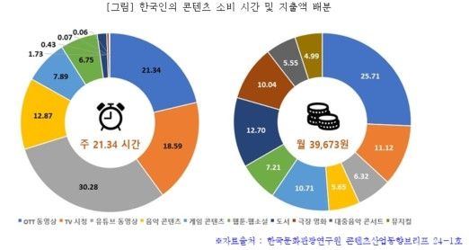 한국인의 콘텐츠 소비 시간 및 지출액 배분 그래픽. 한국문화관광연구원 제공. |