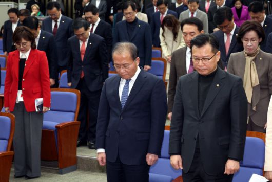 윤재옥 국민의힘 원내대표를 비롯한 의원들이 1일 오후 서울 여의도 국회에서 열린 의원총회에서 순직한 소방관들을 추모하며 묵념을 하고 있다. (사진=뉴시스) |