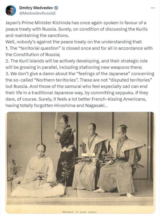 메드베데프 부의장은 이 글에서 에도시대 아코번(현 효고현) 다이묘(봉건 영주) 아사노 나가노리가 할복을 강요당하는 그림을 함께 게시했다.