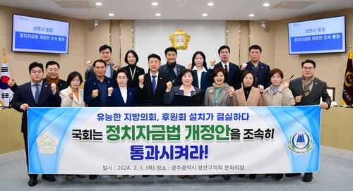 (광주=연합뉴스) 정회성 기자 = 광주 광산구의회는 1일 "지방의원의 상시 후원회 설치를 가능하게 한 '정치자금법 개정안'의 국회 통과를 촉구한다"고 밝혔다.