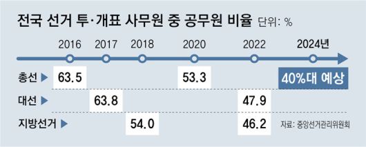 문제는 최근 선거사무의 핵심 인력인 공무원들이 적은 수당 등을 이유로 선거사무 참여에 단체 거부 움직임을 보이면서 투·개표 인원 확충에 비상이 걸렸다는 것이다. 지난 총선에서 공무원의 선거사무 참여율은 2016년 63.5%에서 2020년 53.3%로 줄었다. 공무원은 통상 투·개표 관리 경험이 있어서 민간인들에 비해 업무 능숙도와 처리 속도가 빠르다. 하지만 공무원 개표사무원이 부족해지면 그 자리를 은행원이나 농·수협 조합 직원, 대학생 등 민간인으로 채워야 하고 이 경우 개표 시간 지연으로 이어질 가능성이 크다는 게 선관위 측 설명이다.