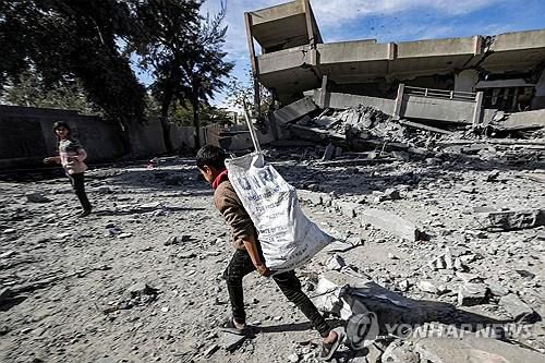가자지구에서 UNRWA 적힌 봉지 들고가는 소년 |