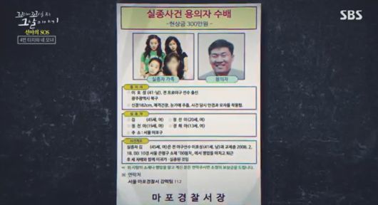다른 증거가 없으니 경찰은 실종으로 결론을 내릴 수밖에 없었던 거야. 이번에도 실종된 네 모녀를 찾지 못하면 이호성은 빠져나갈 구멍이 생기는 거야. 아무리 의심이 가도 죄를 묻기 힘들어져. 결국 담당 형사들은 공개수사를 하기로 결단을 내렸어. 시민들의 적극적인 제보를 얻기 위해, 이호성을 네 모녀 실종 사건의 용의자로 특정하고 전국 수배를 내린 거야.