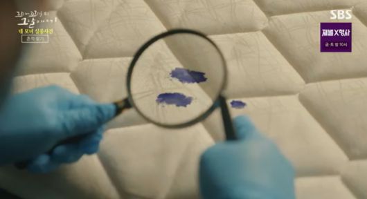 근데 매트리스에 뭔가 거뭇한 자국이 군데군데 보여. 자세히 보니까, 군청색 잉크야. 형사의 눈엔 실수가 아니라 일부러 묻힌 거 같아. 그래서 바로 잉크가 묻은 곳에 특수약품처리를 해봤어. 그러자, 혈액 반응이 검출됐어. 누군가 피를 흘렸고, 누군가는 그 피를 잉크로 감추려 한 거야.