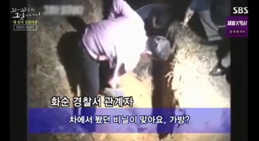 용기를 내서 제보를 해준 유 씨의 이야기는 결정적이었어. 형사들은 지원인력을 총동원해서 유 씨와 함께 그 묘지로 가. 그런데 현장에 도착하자 난감한 상황이 벌어졌어. 이미 작업한 지 20일이 지난 데다가 늦은 밤이라, 제보자가 정확히 어딜 팠는지 찾지 못하는 거야. 어렴풋이 가리킨 곳 인근을 경찰들이 샅샅이 수색하기 시작했어. 얼마나 시간이 지났을까. 그러다 뭔가를 발견해.