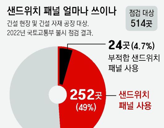 2일 동아일보 취재를 종합하면 국토부와 한국건설기술연구원이 2022년 전국 건설 현장 및 건설 자재 공장 514곳을 대상으로 불시점검을 한 결과 252곳이 샌드위치 패널을 사용한 것으로 파악됐다. 샌드위치 패널은 얇은 철판이나 판자 속에 스티로폼, 우레탄 등 단열재를 넣은 건축 자재다. 낮은 단가로 물류 공장이나 창고 등을 지을 때 쓰이지만, 작은 불꽃에도 쉽게 불이 번지고 유독가스를 다량으로 내뿜어 화재 시 큰 피해를 일으킨다.