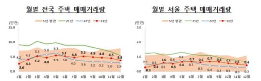 이들 대책들이 발표되기 이전의 부동산 지표들도 이미 내리막길을 보이고 있다. 최근 2023년 12월 주택통계에 따르면 주택 매매 거래량(신고일 기준)은 3만8036건으로 전월보다 16.2% 줄어 4개월 연속 감소세다. 2019년 12월(11만8000건)과 2020년 12월(14만건) 거래량에 한참 못 미치는 수준이다. 서울 아파트 거래량은 1천790가구로, 월간 거래량이 1000건대로 다시 떨어지면서 역대 최저급으로 떨어지고 있다.