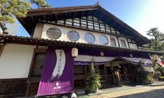 호시료칸 외부 전경. 718년 나라 시대 승려 다이초 대사가 백산(하쿠산)에서 수행하던 중 인근 마을에 병을 치유할 수 있는 온천이 있다는 계시를 받고 제자를 시켜 만들었다는 얘기가 전해진다. |