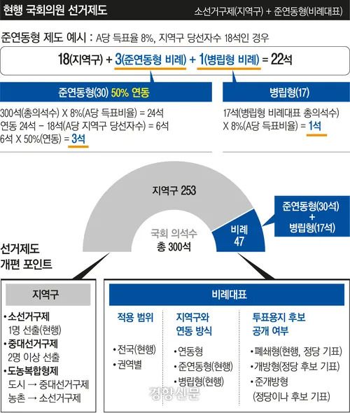 지난 총선에 적용했고, 이날 이 대표가 추진하겠다고 밝힌 제도는 소선거구에 전국 단위 폐쇄형 명부 준연동형 비례대표제라고 부를 수 있다.